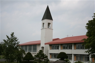 これが近くで撮影した尖塔のある美馬牛小学校です。
