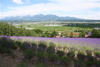十勝岳連峰(主峰十勝岳)を背景にしたラベンダー畑の写真です。
